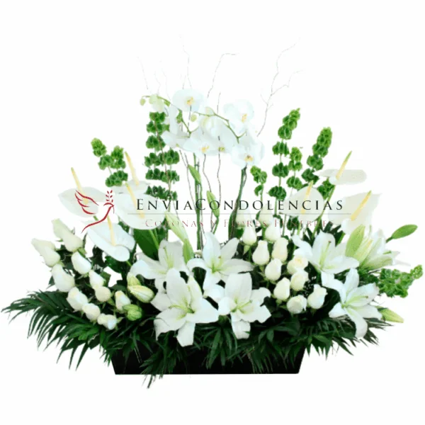 Elegante y majestuoso arreglo, digno de la última despedida. Arreglo fúnebre elaborado con 2 docenas de Rosas blancas de invernadero, Flores de casablancas, 7 Anturios blancos, una planta de Orquídea Phalaenopsis doble tallo en color blanca entre Molucella, Jumbo y Curli willow, en una jardinera de mdf color chocolate.