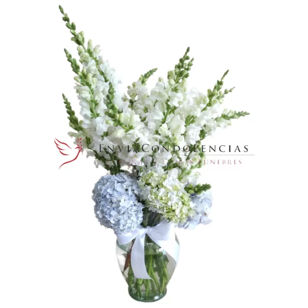 En una ocasión tan dolorosa, bellas flores son una gran compañía para el alma. Envía flores con este bonito bouquet con una decena de Dragonarias blancas entre flor de Hortensia en un florero de vidriocon un atado de listón al cuello.
