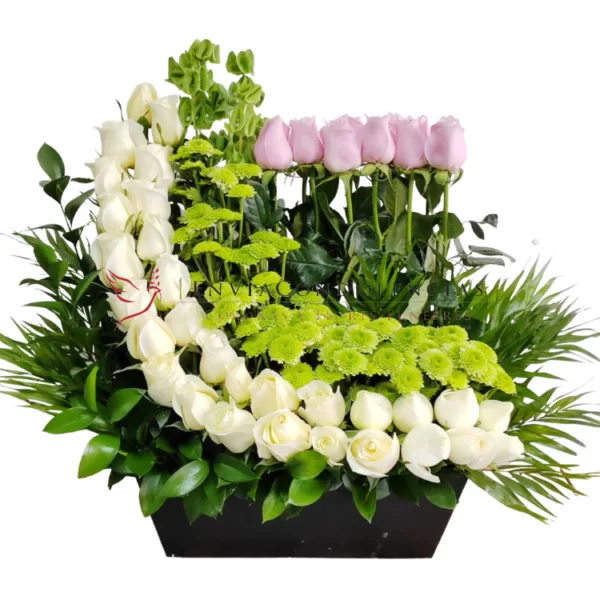 Nunca es tarde para solidarizarte con la familia de ese ser querido que ha partido. Envía flores que representan tu cariño y respeto con este bello arreglo de 2 docenas y media de Rosas de invernadero en color blancas más una docena de Rosas de invernadero en color rosa con un toque de Yoko y follaje de Campanilla, Ruscus y Jumbo en nuestra hermosa jardinera de mdf chocolate.