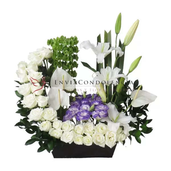 Recibir tus condolencias con un arreglo bello, abraza el corazón y consuela el alma. Envía tus condolencias con este hermoso arreglo fúnebre elaborado con 3 flores de Anturio, 30 Rosas blancas de invernadero, 3 tallos de Casablanca (12 flores o más), una decena de tallos de flores de Lisianthus doble tono (morado y blanco) y finos follajes: Molucella, Fornios y Ruscus, en una jardinera de madera (mdf) café.