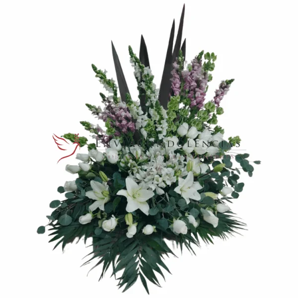 Te invitamos a enviar flores que inspiran paz y consuelo. Nuestro arreglo “Alma en Paz” es un abrazo floral en esta última despedida, diseñado con dos docenas de rosas de invernadero blancas, la majestuosidad de las Casablancas, la delicadeza de las Alstroemerias blancas, y una decena de Dragonarias en blanco y otra más, en rosa. Entre follajes de Fornios, Molucella, Jumbo y Dólar Papalo, cada flor es un bálsamo para el alma.