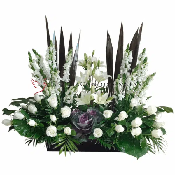 La vida es una y sólo una vez nos despedimos de ella, honra ese último momento con un elegante y generoso arreglo fúnebre elaborado con dos docenas de Rosas blancas, una decena de flores de Dragonaria blancas, Casablancas, flores de Col con finos follajes de Fornios, Jumbo, hojas de Piñanona y Ruscus en una jardinera de mdf color chocolate.