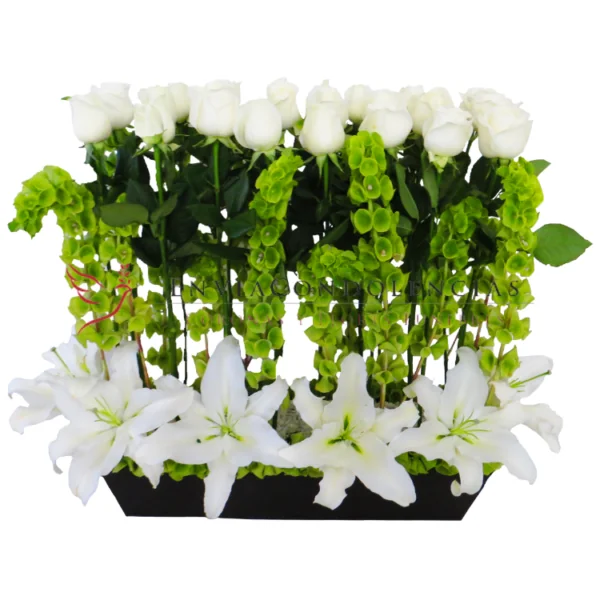 Envía Flores el mismo día para la última despedida. Arreglo de 2 docenas de Rosas de invernadero “sembradas” en una jardinera de madera (mdf) bordeada en su filo con Flores de Campanilla y un toque de flores de Casablancas.