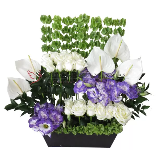 Envía flores de condolencias hermosas, dignas de la última despedida a ese ser querido. Arreglo fúnebre elaborado con 5 flores de Anturios, 2 docenas de Rosas de invernadero, una decena de tallos de Lisianthus, Molucellas y follaje de Fornios, en una base de madera MDF.