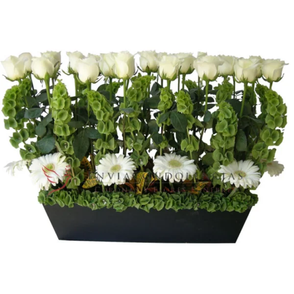 Hermosas flores merece el haberle conocido, despídele con este arreglo elaborado con 2 docenas de Rosas Blancas, con flores de Gerberas al píe de las rosas y flores de Campanilla Irlandesa cercando las rosas y bordeando la orilla de la base de jardinera mdf tono chocolate.