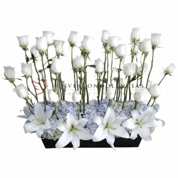 El llanto por la pérdida de un ser querido alivia el alma, drena el dolor del corazón que siempre le recordará con gran cariño. Envía tus condolencias con este hermoso arreglo fúnebre, elaborado con 48 Rosas blancas de invernadero depiladas de toda espina y follaje, “sembradas” entre abundantes flores de Hortensia y 10 flores aromáticas de Casablanca, en una jardinera de MDF tono chocolate.