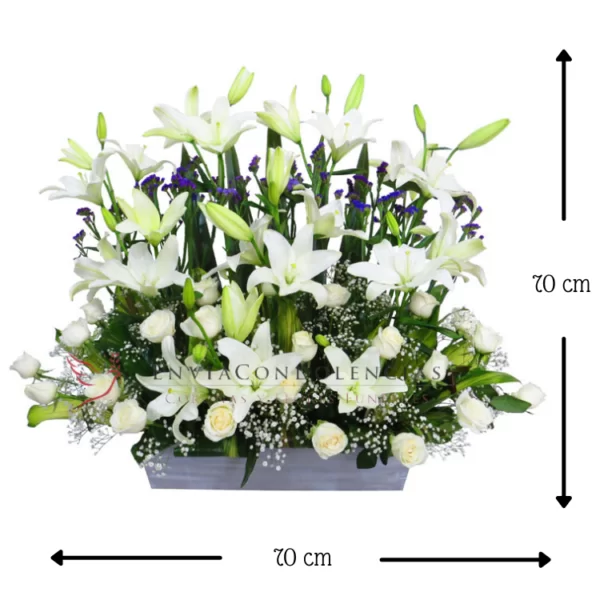 Envia un mensaje que evoque su memoria y consuela su espíritu, este diseño floral es un tributo fúnebre sereneo y emotivo, diseñado con dos docenas de rosas de invernadero, una decena de tallos de lilis, un toque de flor de velo o baby y detalle de flores de Stati en tono morado. Enmarcado por la elegancia de hoja de drácena y fornios, y presentado en una base de madera MDF, es un refugio de paz.