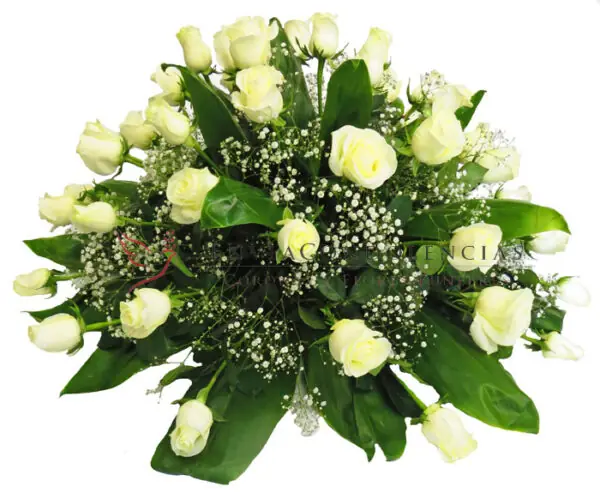 La paz en un momento tan difícil es posible de alcanzar con la compañía de seres amados y hermosas flores. Envía tus condolencias con este arreglo de dos docenas de Rosas blancas entre flor Baby y follajes.