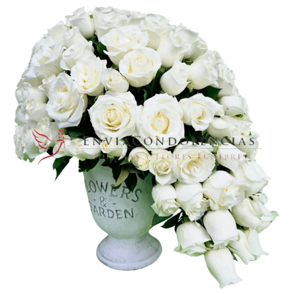 En nuestra florería, creamos más que un arreglo; tejemos un poema de despedida. Para perpetuar el recuerdo y ofrecer consuelo en la distancia, te invitamos a enviar flores con nuestro distinguido arreglo funeral: 96 Rosas Blancas de Invernadero que caen como un río de estrellas sobre nuestra elegante base de cerámica tipo copa de Flowers and Garden. Un tributo sublime que honra la memoria y acaricia el alma.