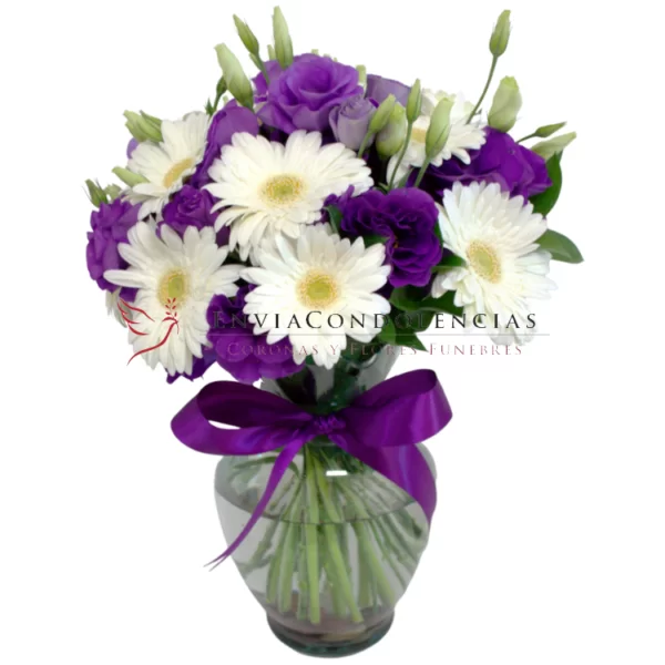 Envía un abrazo de solidaridad, acompañado de hermosas flores, a quien a perdido un ser querido. Arreglo elaborado con flores de Lisianthus color morodo, una decena de Gerberas blancas colocadas en un florero de vidrio de primera calidad con un moño morado.