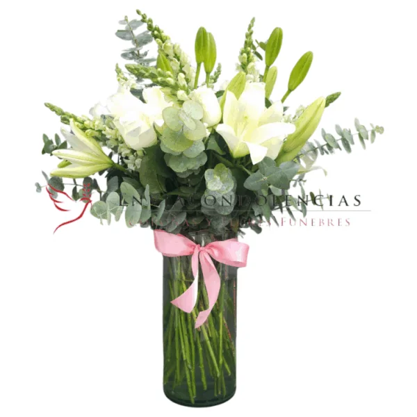 Envía tus más sinceras condolencias con este símbolo de paz y recuerdo. Arreglo fúnebre elaborado con 24 Rosas Blancas de invernadero, 4 tallos de Lilis blancas, 10 Dragonarias blancas entre follaje de Dólar en nuestra elegante y sotisficada base de vidrio tipo cinlindro y con un moño en tono rosa.
