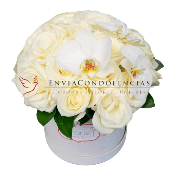 Regala flores funebres y hazles saber que estas con ellos en este difícil momento, aunque estés lejos. Envía este arreglo fúnebre con 36 Rosas de Invernadero blancas y posadas sobre ellas 3 Flores Orquídeas Phalaenopsis blancas en nuestra caja de mdf cilindrica blanca.