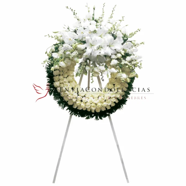 Envía flores de condolencias que son la luz que iluminan el camino. Hermosa corona fúnebre elaborada con más de 144 Rosas de invernadero blancas, 2 tallos de Orquídea Phalaenopsis, flores de Lisianthus, flores de Espuela o Matiola y Casablancas formando un medallón.