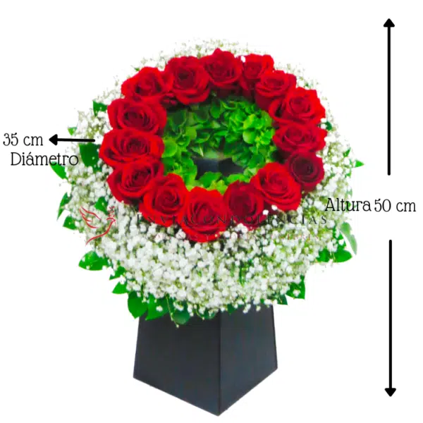 Dios sabe que no debemos avergonzarnos nunca de nuestras lágrimas, pues son lluvia que cae sobre el polvo cegador de la tierra que endurece nuestros corazones. Abraza y consuela sus lágrimas con esta preciosa corna elaborada con abundante Flor de Velo, 15 Rosas de invernadero rojas entre follaje de Campanilla y Ruscus.
