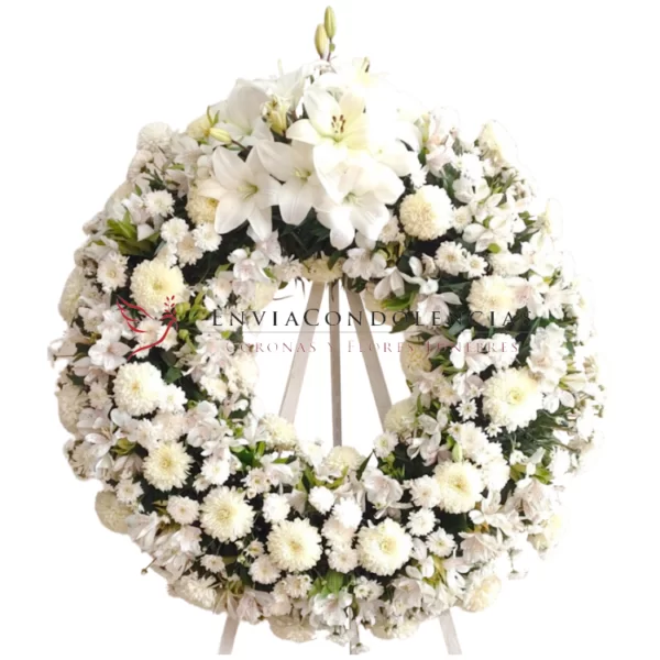 Si tu deseo es despedir con una corona especial a esa persona querida y admirada, envía esta corona fúnebre elaborada con flor de Polar, Margaritas blancas, Alstromelias blancas, un medallón de flor de Casablancas entre follaje de Jumbo.