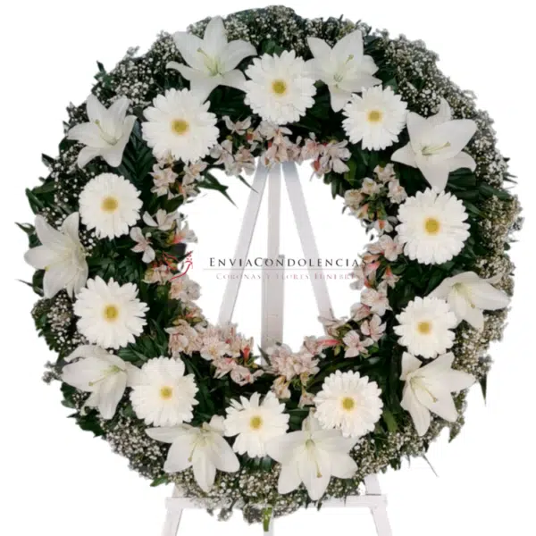 Envía tus condolencias con nuestra corona funebre “Angel Celestial”, es un bello y conmovedor tributo, una expresión sincera de respeto y solidaridad. Elaborada con una decena flores de Gerbera acompañadas con Alstromerias que semejan mariposas posadas entre el follaje, una decena de Casablanca y flor de Velo en la circunferencia. Va montada de manera segura y elegante en su tripié, que la realza con dignidad sin necesidad de apoyarse en muros. Ordena esta corona, una de las más solicitadas.