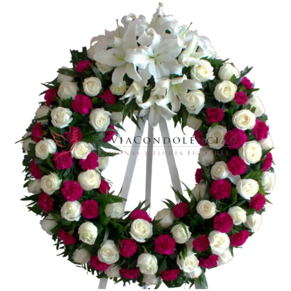 Envía flores que son un homenaje en su última despedida. Preciosa corona fúnebre elaborada con 4 docenas de Rosas de invernadero blancas entre Clavel fiusha o vino (sujeto a disponibilidad) entre follaje de Jumbo y en la parte superior de la corona un medallón de Flores aromáticas Casablancas.