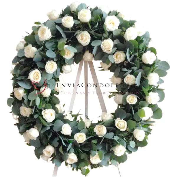 En este momento de sensible adiós, nuestra florería te ofrece la Corona “Ángel Guardián”, un homenaje sublime para ese bello ser humano que ha partido. Elaborada con ses docenas de rosas (72 flores) de rosas de invernadero blancas entre fino follaje de dólar, esta corona es el gesto perfecto para enviar flores que expresen amor y respeto eterno. Montada de manera elegante y segura en un tripie que le da porte y elegancia. Envía tus flores de condolencias para honrar su memoria con esta pieza de profunda belleza y significado.