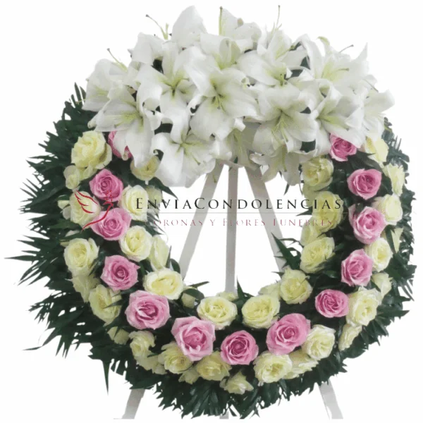 Envía tus condolencias con esta hermosa Corona Fúnebre elaborada con Rosas de invernadero en tono rosa y blancas con un hermoso medallón de Casablancas aromáticas que son una bella ofrenda floral para esa persona que ha partido para siempre, flores para solidarizarte con sus seres amados.