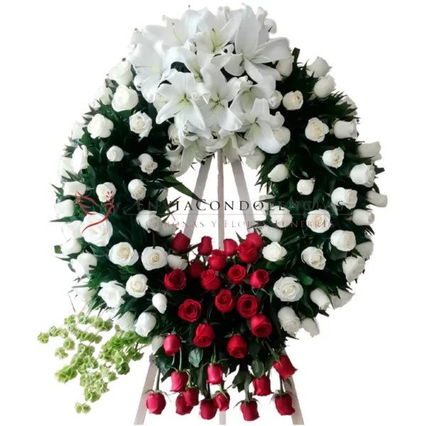 Las flores llenan de luz nuestra alma y sanan la tristeza. Despide a ese ser amado que ha partido con esta corona especial elaborada con 6 docenas de Rosas de invernadero blancas entre follaje de Jumbo con 2 docenas de Rosas de invernadero Rojas en forma de cascada y un medallón en la parte superior de Flores aromáticas de Casablancas y un toque de Campanilla.