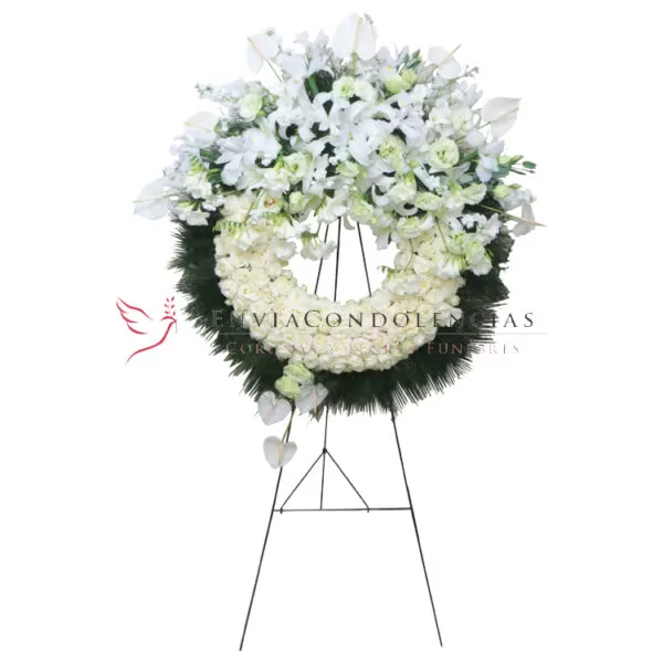 Envía flores de condolencias que son la luz que iluminan el camino, que son un homenaje a la vida que parte. Preciosa corona funeraria montada en tripie, elaborada con 144 Rosas de invernadero blancas, 35 flores de Lisianthus (una decena de tallos), 10 flores de Anturium blanco, 10 tallos de flores de Matiola blanca, una decena de Iris blancos, 15 flores de Casablanca y en la orilla de la circunferencia follaje de camedor Jumbo.