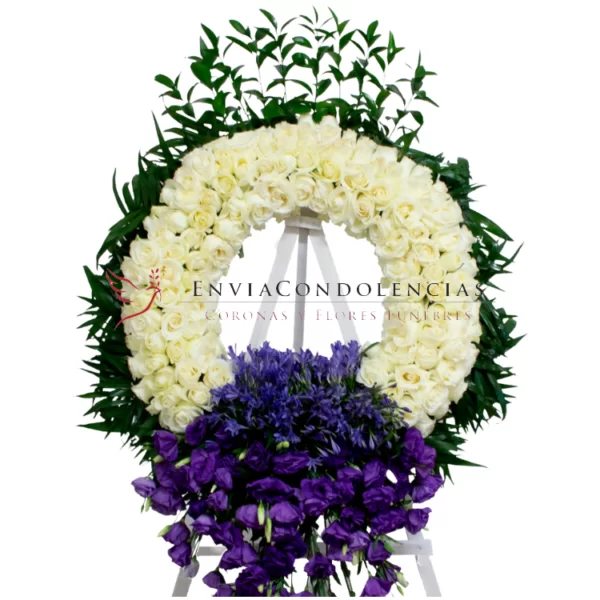 Esta majestuosa corona funeraria, con 144 rosas de invernadero, Lisianthus y una decena de Agapandos azules, es un faro de luz y consuelo. Finos follajes de Ruscus y Jumbo enmarcan esta ofrenda. Envía flores que iluminan el camino de quien partió y abrazan el corazón de sus seres amados.