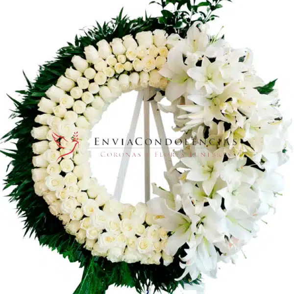 Honra los instantes que el alma atesora con esta sublime corona fúnebre, un tributo poético a quien ha partido. Con 144 rosas blancas, cada una un suspiro de pureza, y un gran tocado de Casablancas aromáticas, realzado por el misticismo del clavo japonés y el espárrago plumoso, esta creación es un abrazo floral. Envía flores que eternicen su recuerdo. Adquiere este símbolo de amor inquebrantable.