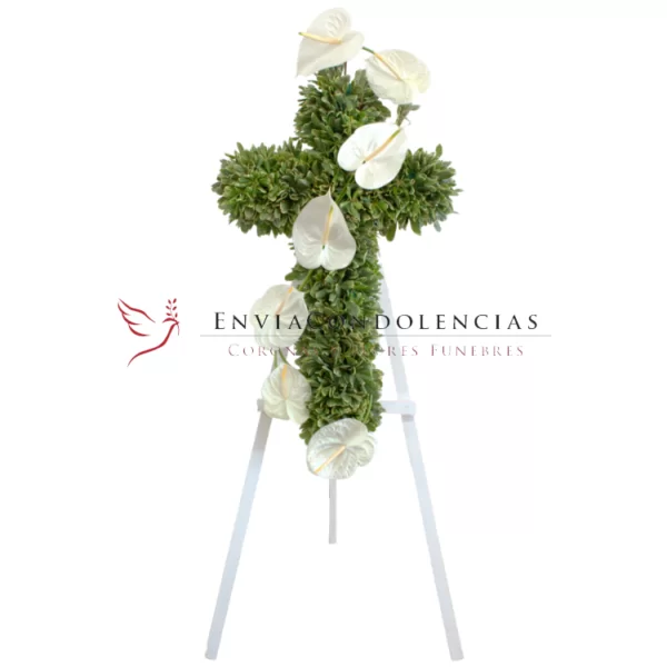 Envía tus condolencias con esta hermosa cruz diseñada para ser un digno homenaje a ese ser especial que ha partido, cruz elaborada con Clavo Japones y 7 elegantes flores de Anturio blanco. Su tamaño es perfecto para su ingreso en salas funerarias.