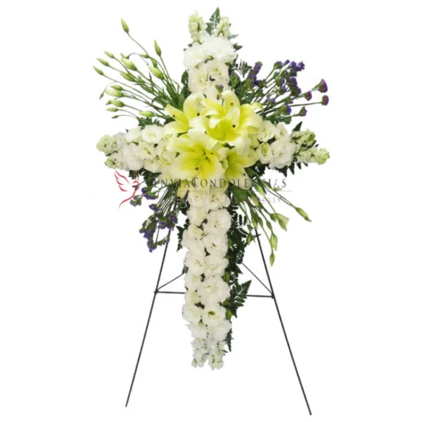 La fé trae consigo consuelo y paz, envía esta fina cruz floral fúnebre para bendecir el camino de tu ser querido que ha partido. Flores de Lisianthus blancos, Estatis, flores de Concador o Casablanca y finos follajes, visten esta hermosa cruz funebre.