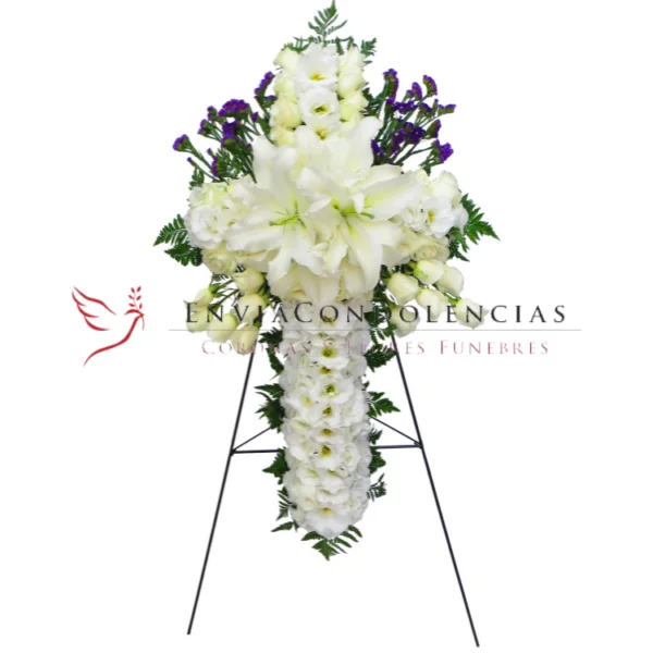 Tus oraciones y pésame serán entregadas con esta cruz fúnebre de finas flores que bendecirá a ese ser querido que ha partido, elaborada con una decena de tallos de Lisianthus, flores aromáticas de Casablanca, Rosas blancas de invernadero, flores de Stati morado y helechos Leader en todo el borde de la cruz.