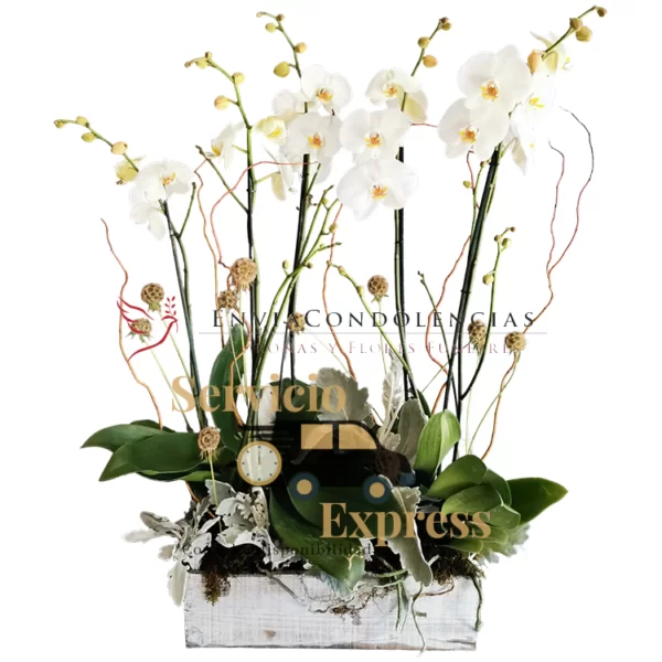 Envía tus condolencias con este bello arreglo fúnebre elaborado con 3 Plantas de Orquídea Phalaenopsis de doble tallo cada una entre Escabiosas, varas de Curli Willow, follajes finos como Miller y Musgo en una base estilo vintage color blanco.