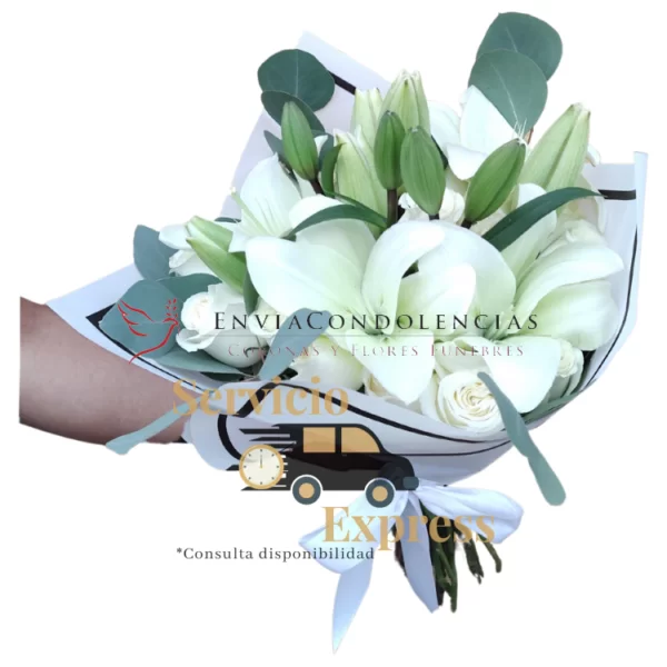 La historia nunca dice adiós, lo que dice siempre es un hasta luego. Envía flores de consuelo con este bonito ramo elaborado con 3 tallos de Lilis blancas y 2 docenas de Rosas blancas de invernadero con un toque de follaje de Dólar papalo, abrazados por papel y un moño de tela.